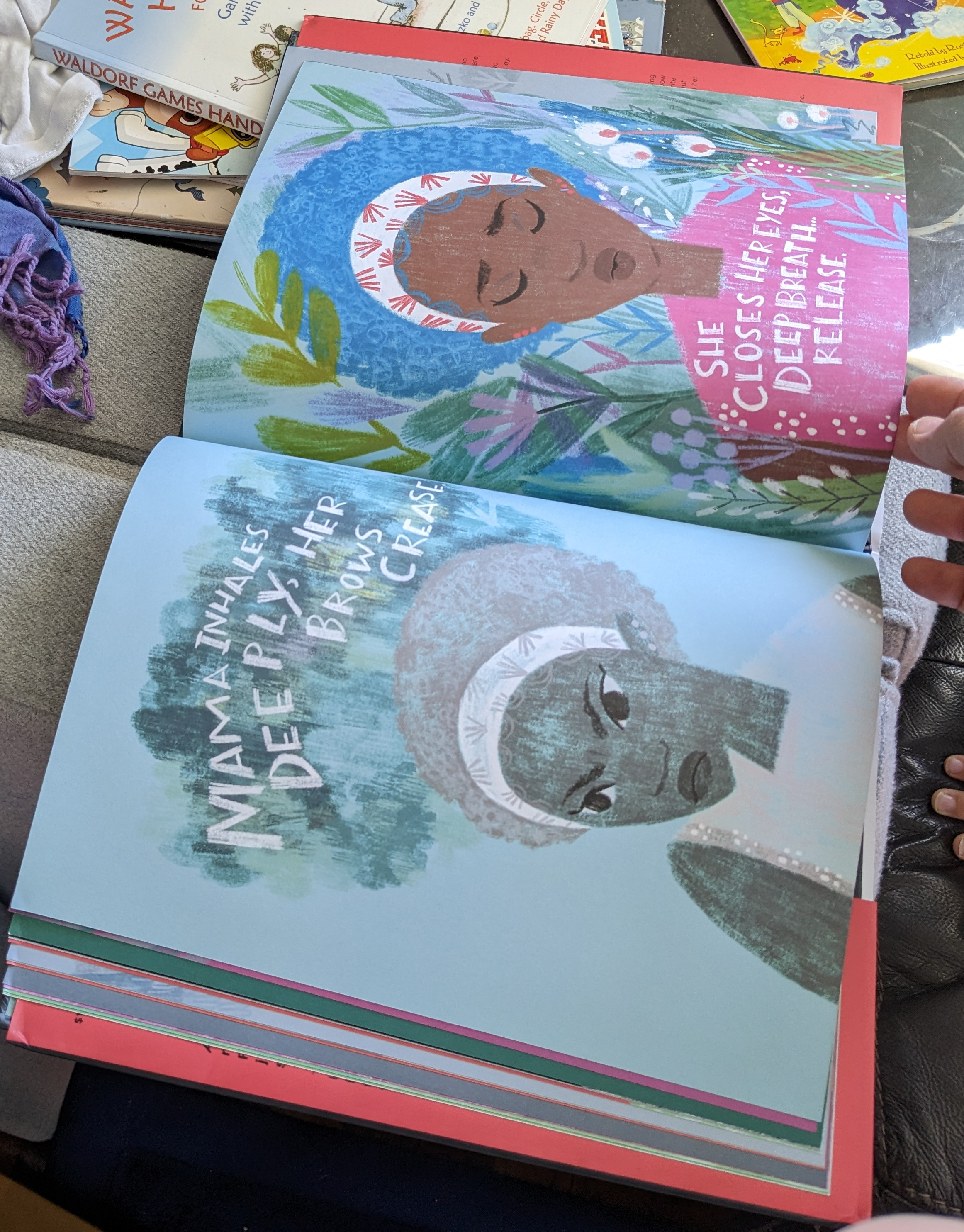 [Photo ID: first photo shows me, light-skinned woman, grinning next to the front of Tiffy’s book. I am seated in front of other books in our loungeroom. Second photo is the book laying open on top of other books and cushions, showing the pages where the mum inhales and exhales in a park, cos she is not gonna let her kid take that shit.]