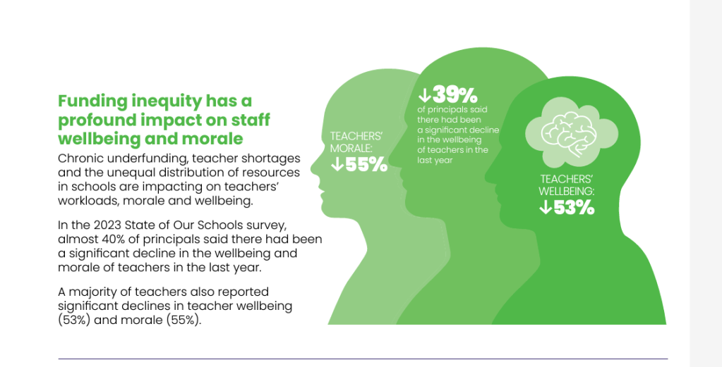 Data provided by the Australian Education Union ‘For Every Child’ campaign** shows the (obvious) link between funding and teacher wellbeing.