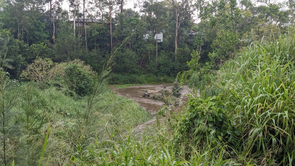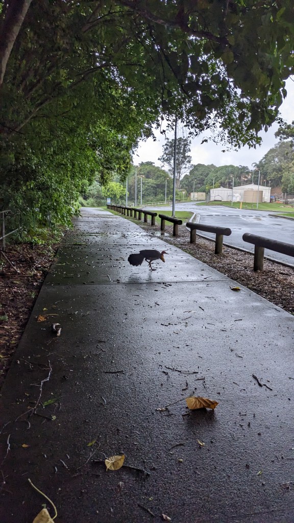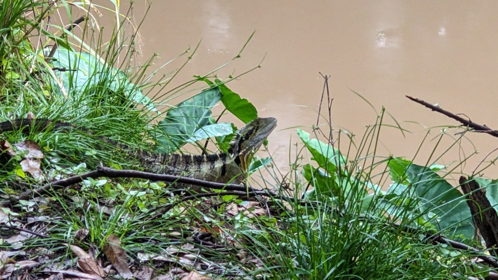 I’ve just walked beside water rushing under the local bridge, forming brown waves and white foam. I saw a tiny azure kingfisher speed past right in front of my face, the third time I’ve seen one, or a pair, in a decade here. I saw a water dragon holding still and eyeballing me. I saw a scrub turkey taking its time across the path.